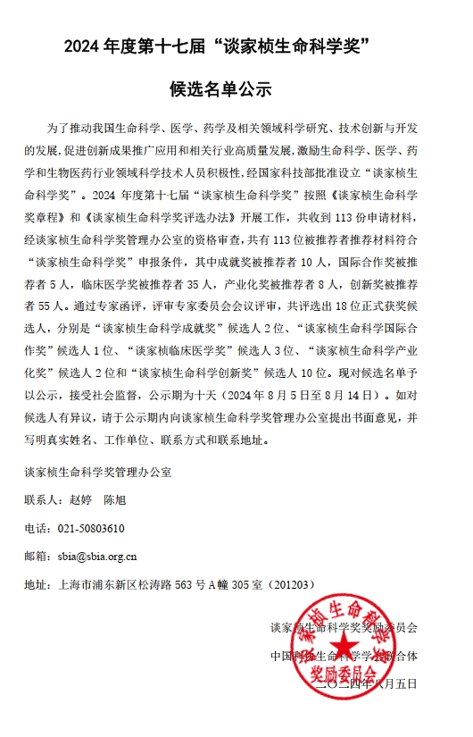 谈家桢生命科学国际合作奖候选名单