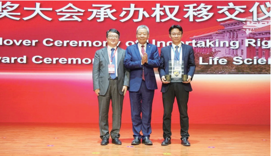 会议期间举行了谈家桢生命科学奖颁奖大会承办权移交仪式。大会承办权由沈阳药科大学交给下一届承办单位中国药科大学。沈阳药科大学校长程卯生与中国药科大学校长郝海平代表双方完成交接。